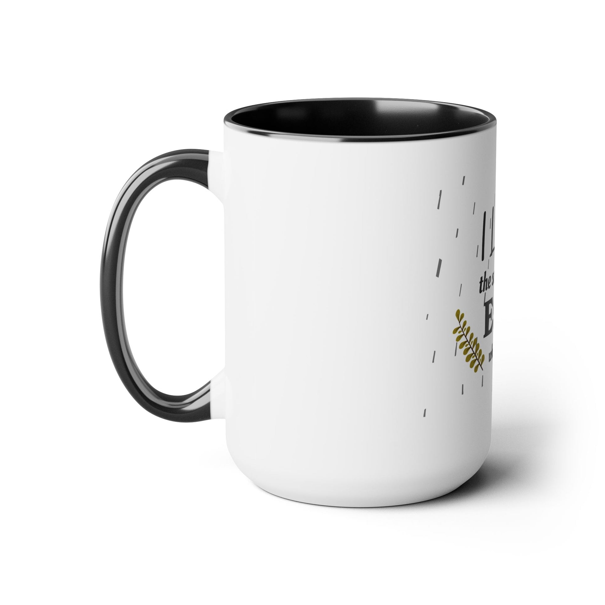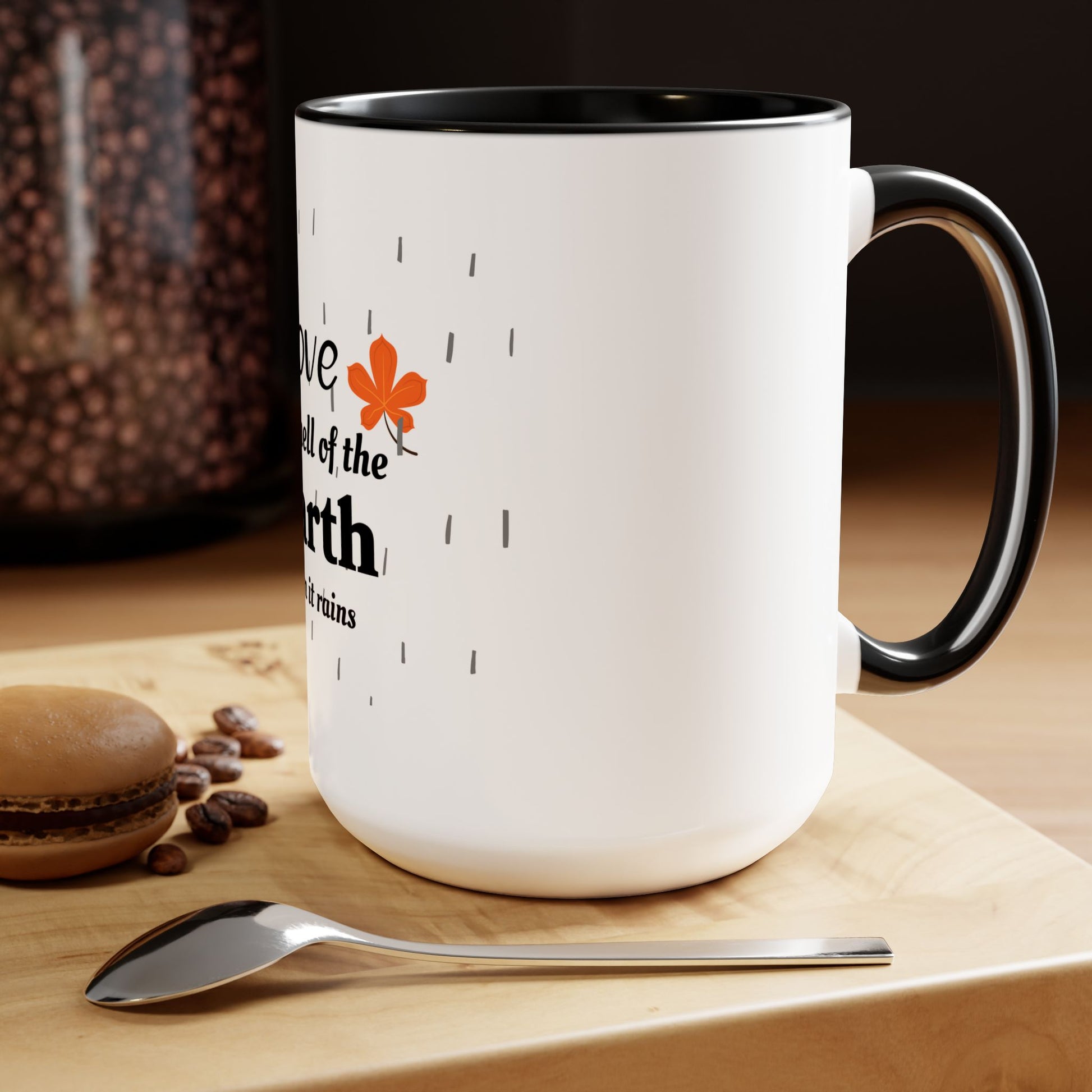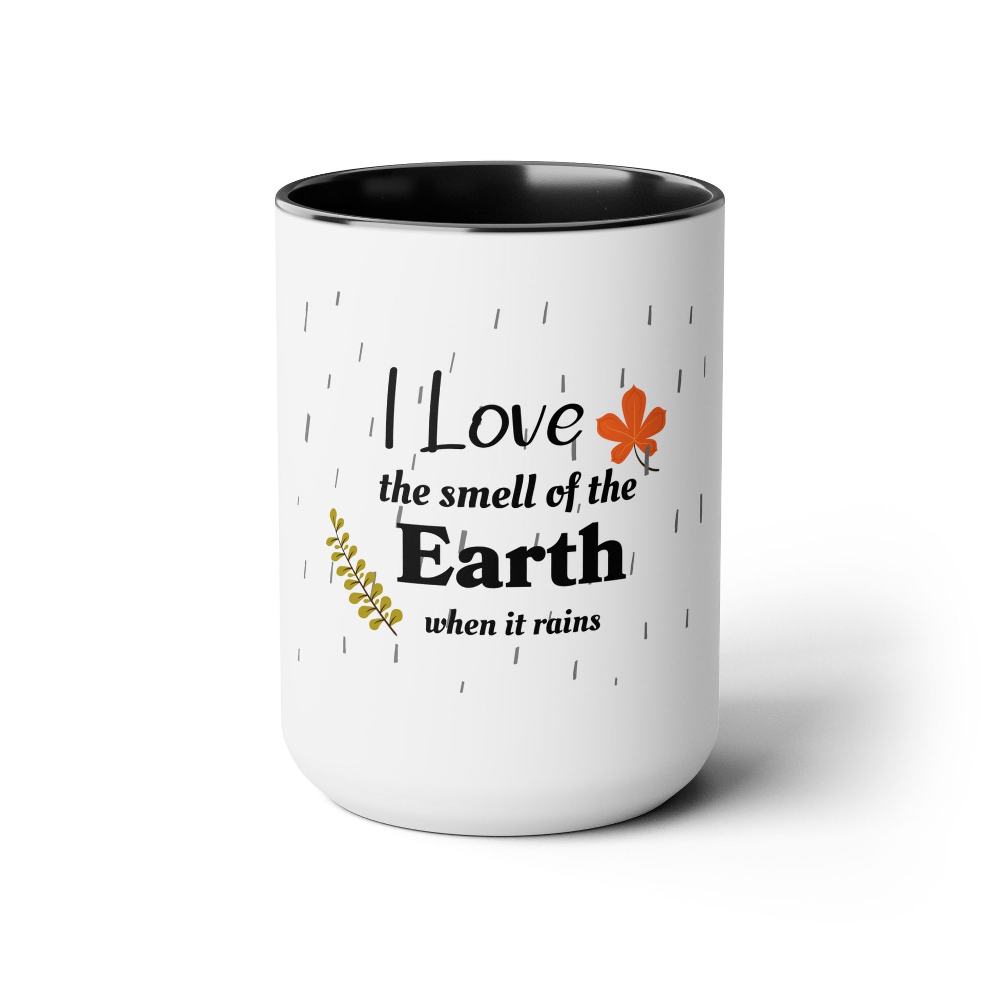 15 oz two-tone coffee mug - white outside, black inside, with the text "I Love the smell of the earth when it rains."
