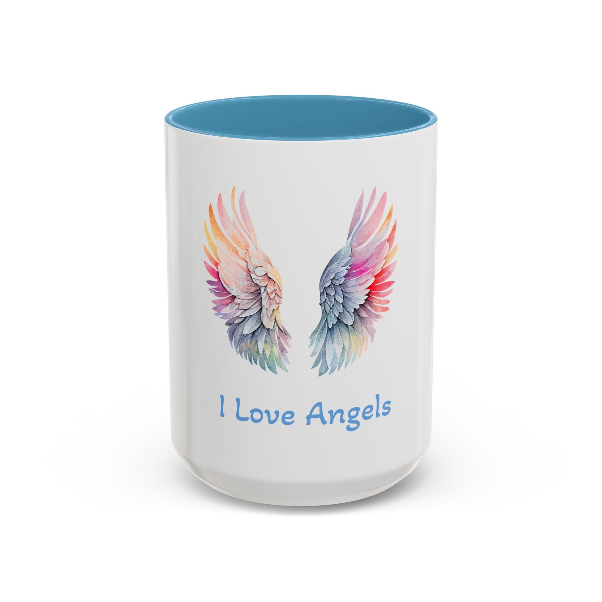 15 oz white coffee mug with blue interior. Has the words "I Love Angels" on it with Angel wings.