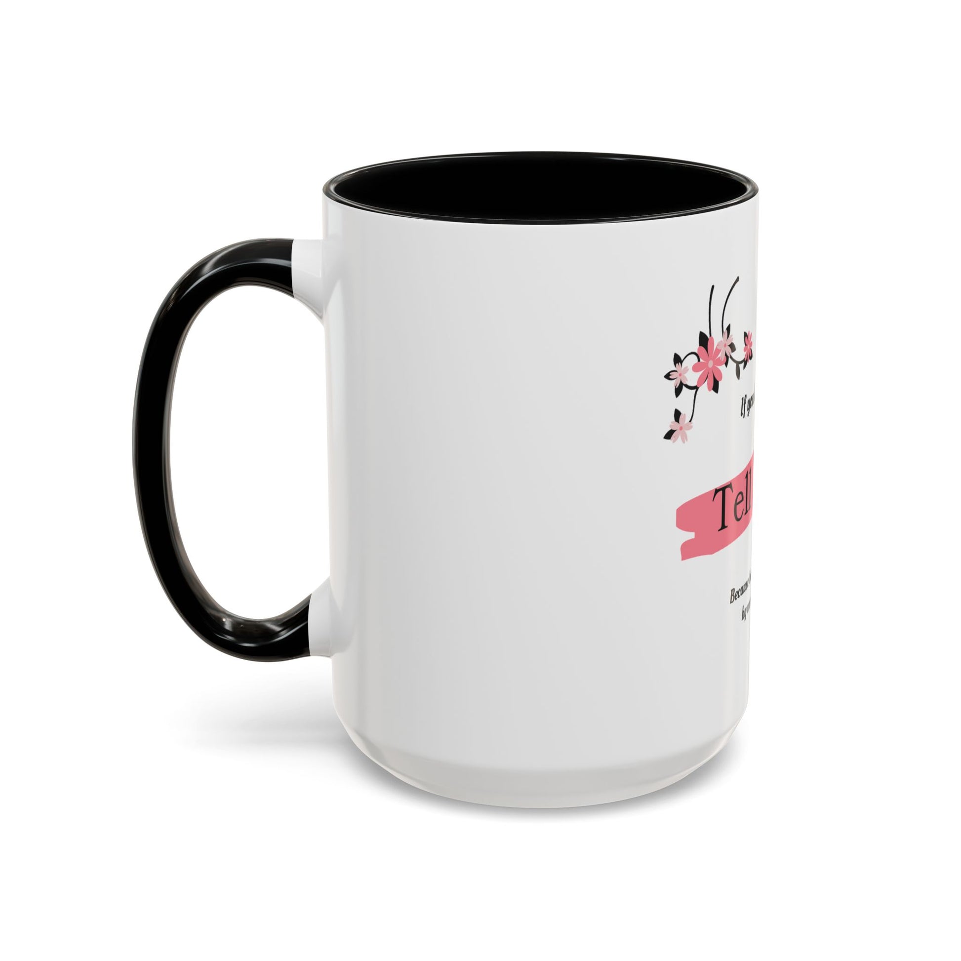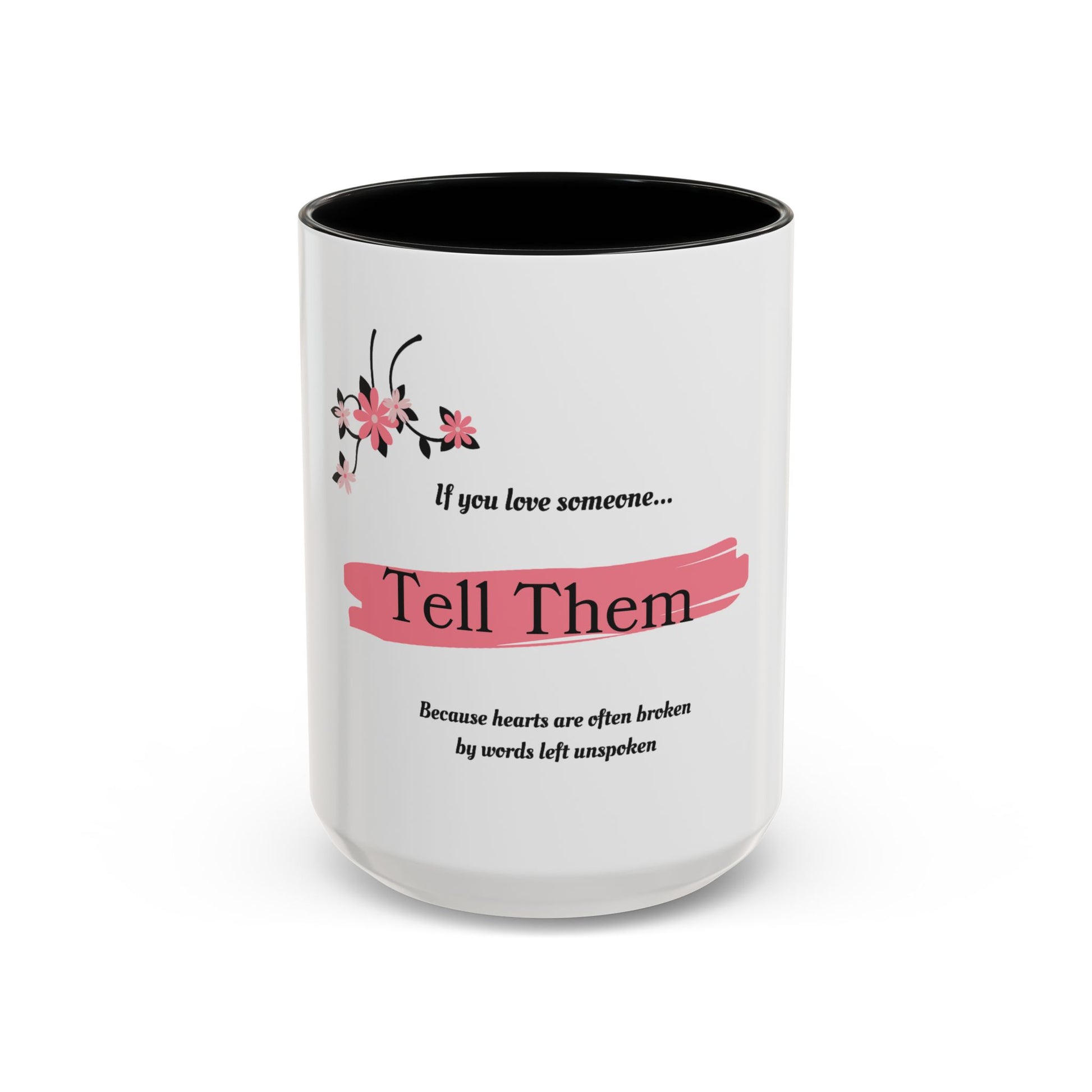 15 oz white mug with black interior. With the words "If you love someone tell them, because hearts are often broken by words left unspoken."