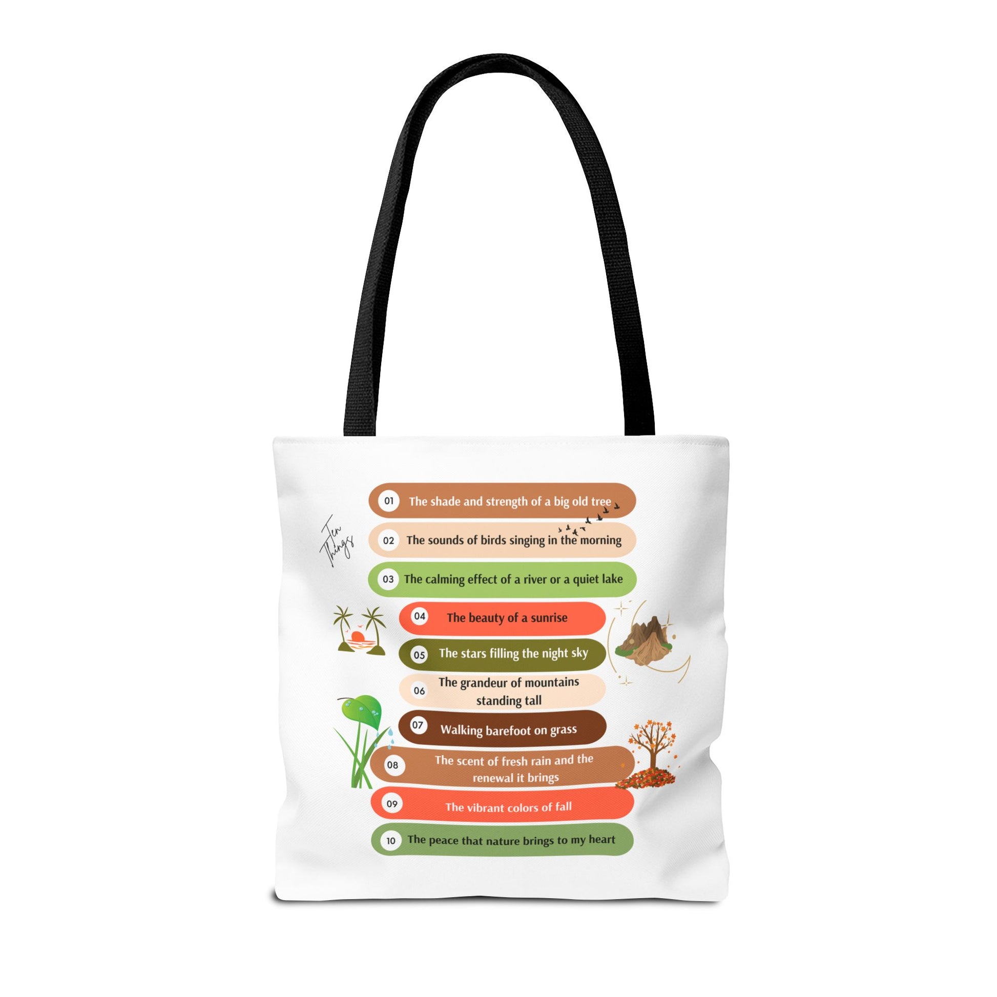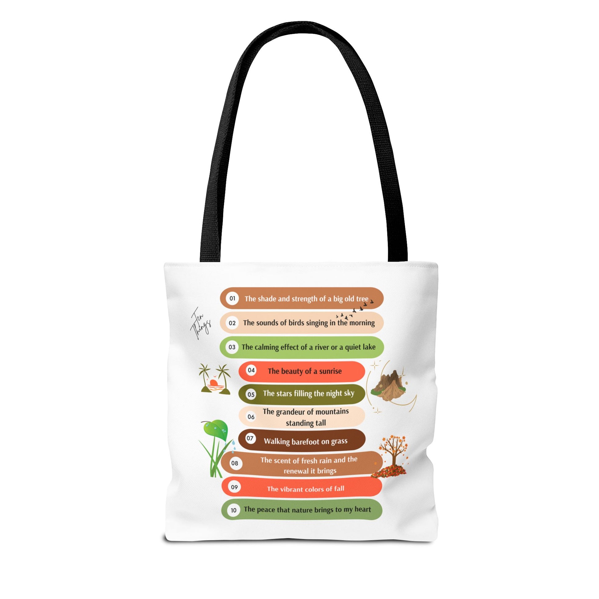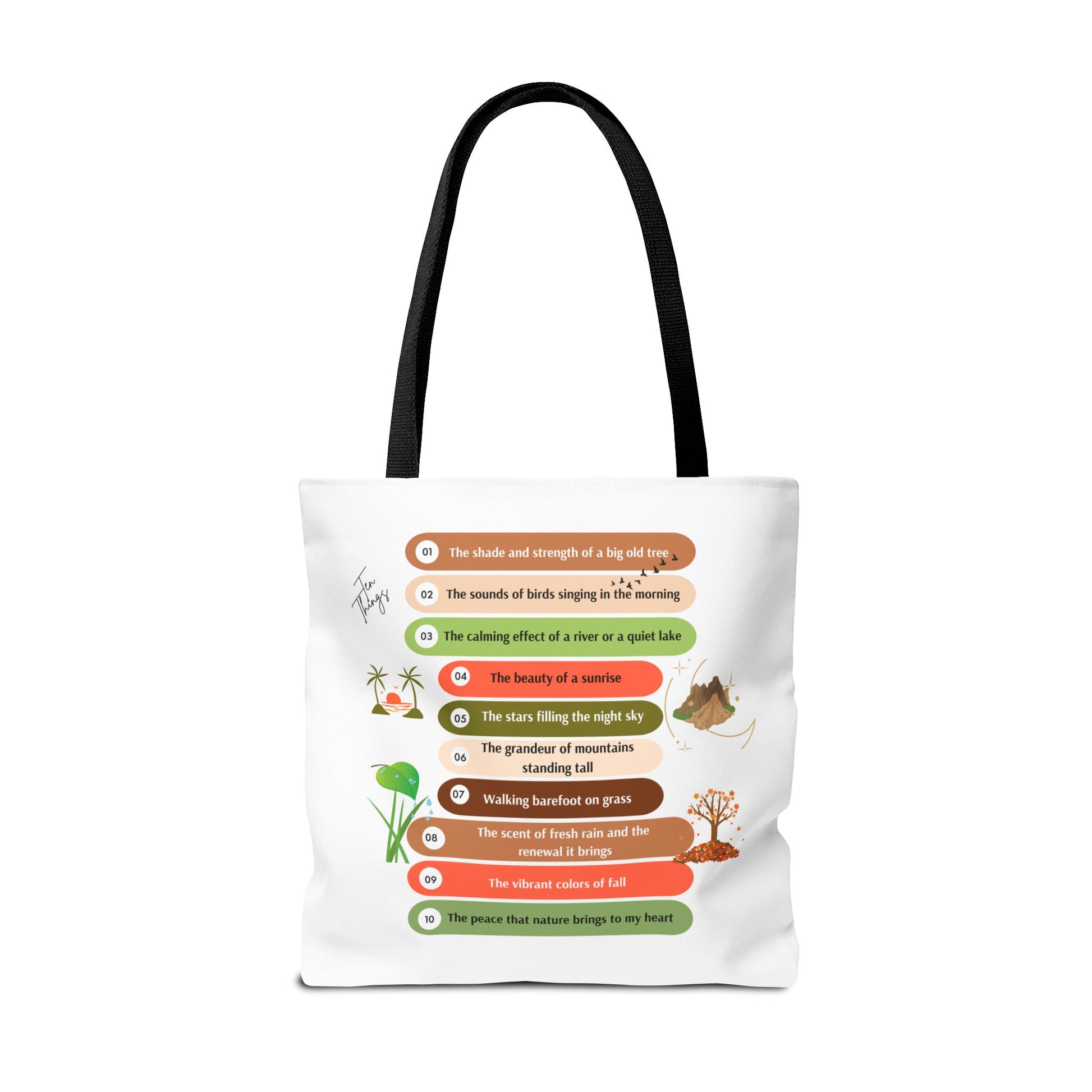 A nature themed tote bag with ten things to love about nature printed on the back. This tote bag exudes a peaceful and eco-conscious vibe, perfect for nature lovers and outdoor enthusiasts. Also, makes a meaningful gift for the nature lover in your life. Fill it with ten nature-themed items, such as seed packets, trail mix, lip balm, hand cream, or an eco-friendly travel mug.