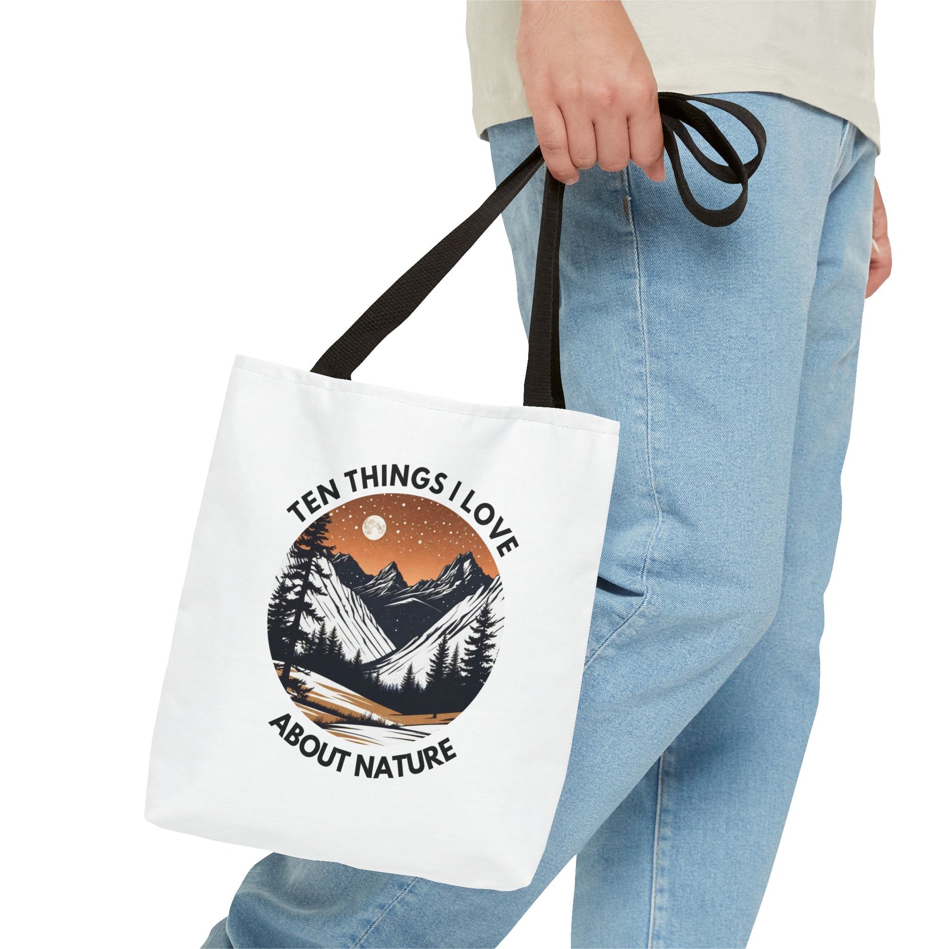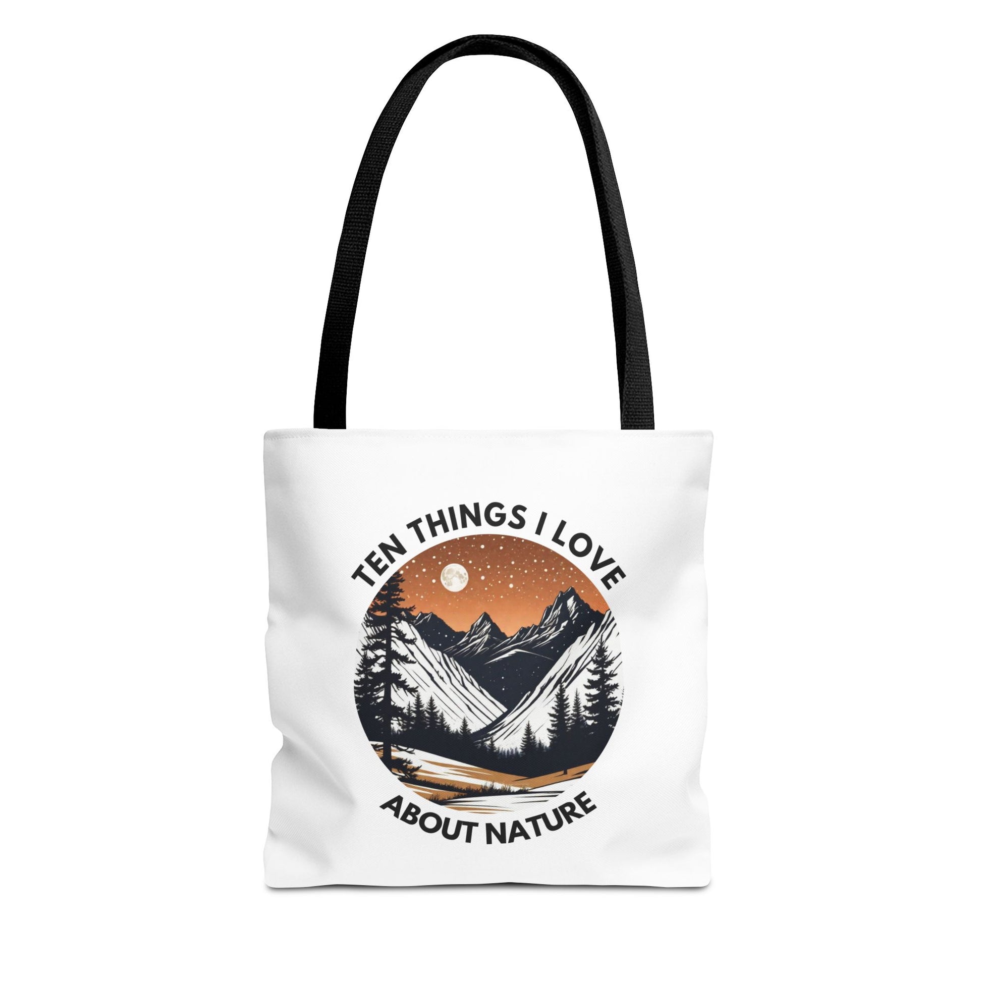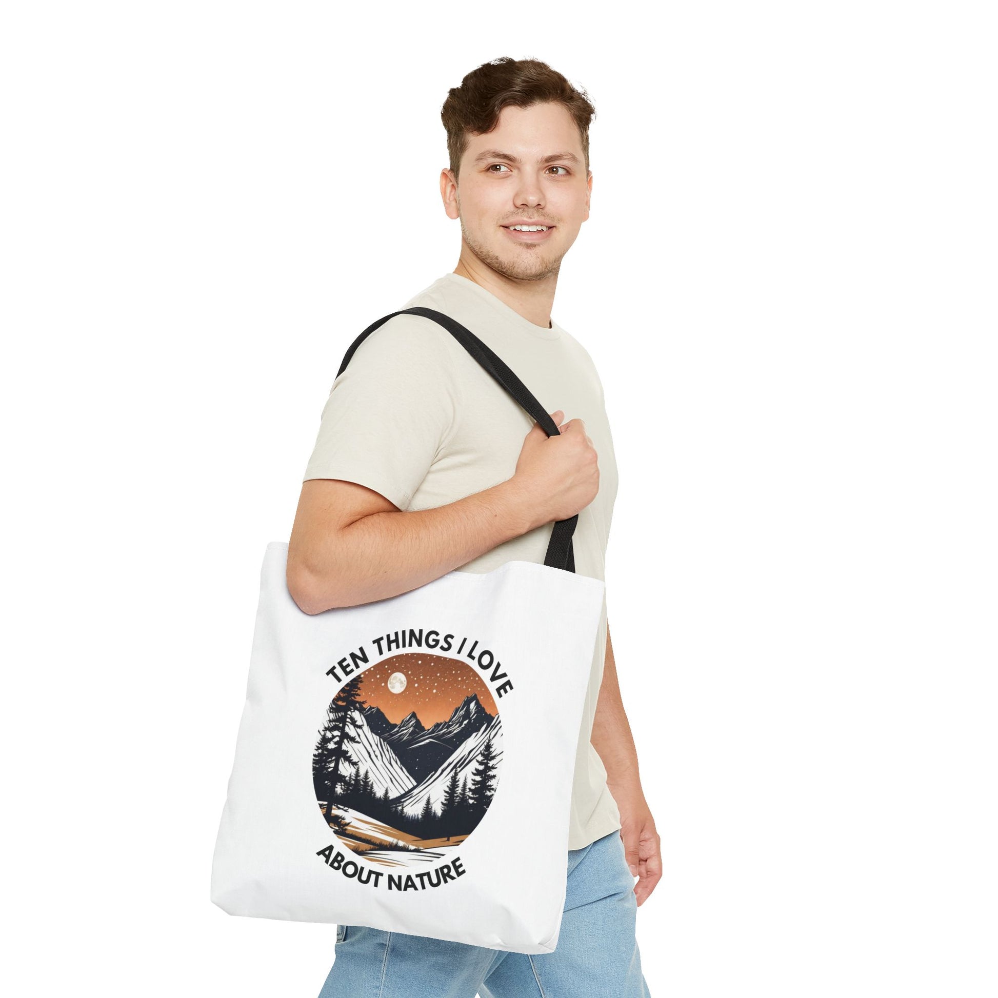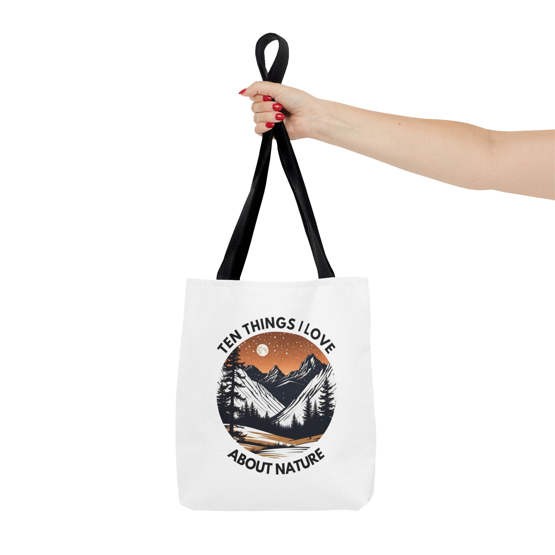 A nature themed tote bag with ten things to love about nature printed on the back. This tote bag exudes a peaceful and eco-conscious vibe, perfect for nature lovers and outdoor enthusiasts. Also, makes a meaningful gift for the nature lover in your life. Fill it with ten nature-themed items, such as seed packets, trail mix, lip balm, hand cream, or an eco-friendly travel mug.